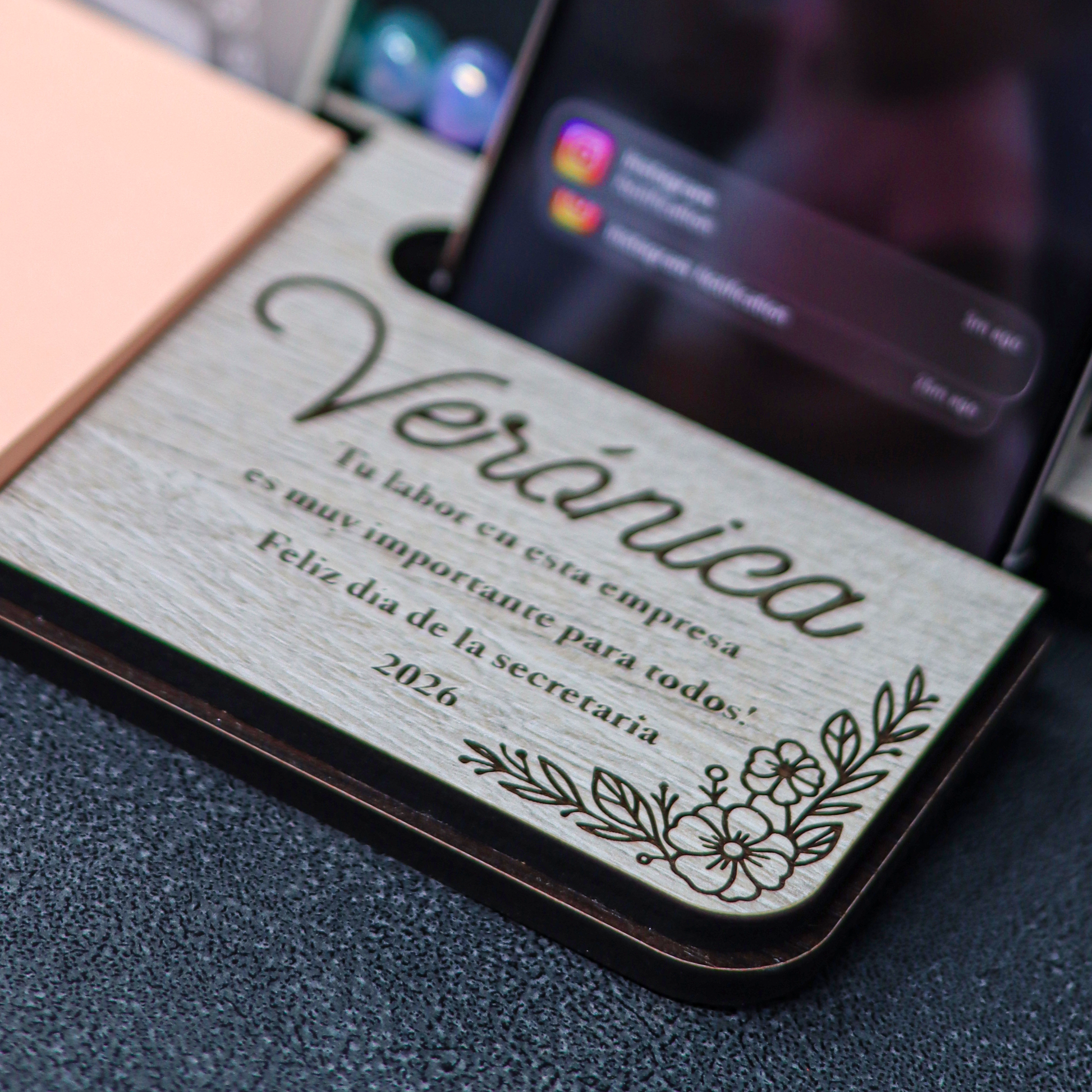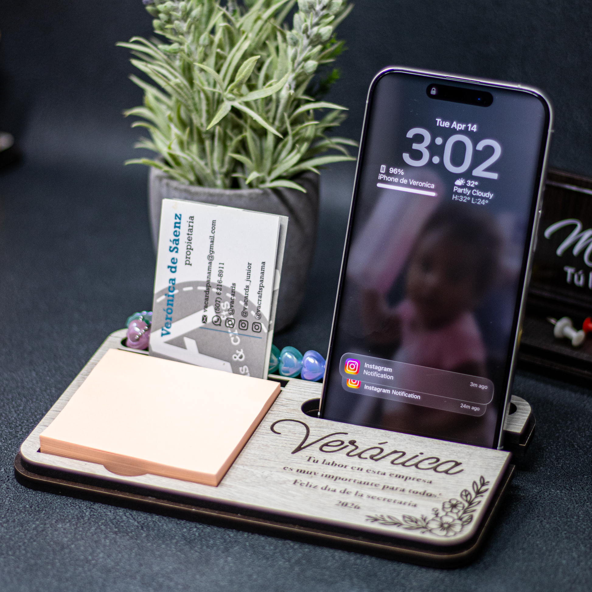 Diseño Multifuncional: Cuenta con un soporte firme para el celular, una ranura para tarjetas de presentación y un espacio a la medida para notas adhesivas.